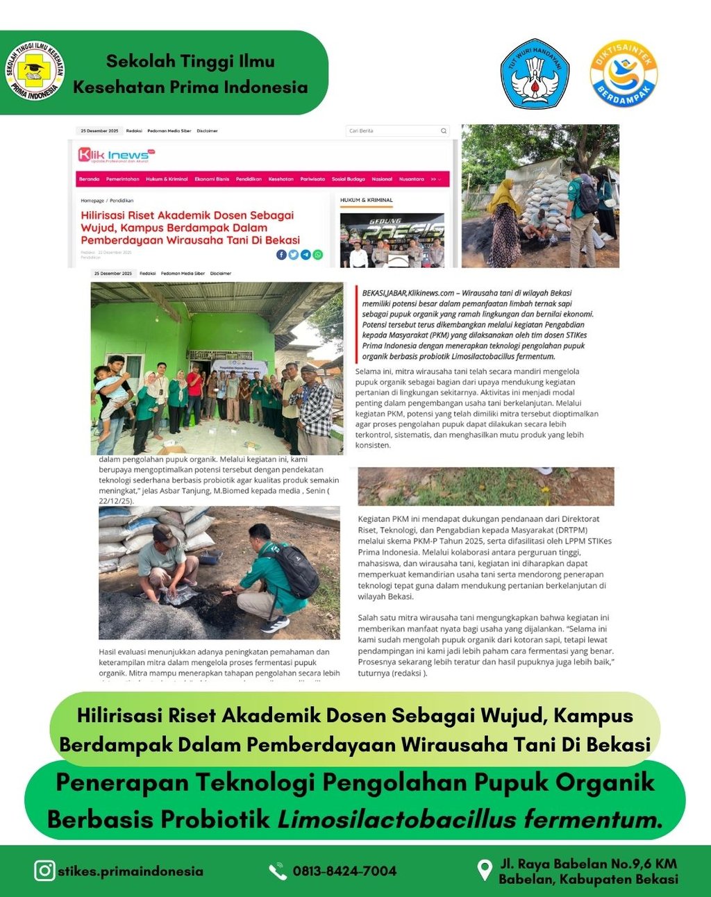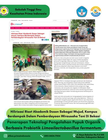 Wirausaha tani di wilayah Bekasi memiliki potensi besar dalam pemanfaatan limbah ternak sapi sebagai pupuk organik yang ramah lingkungan dan bernilai ekonomi. Potensi tersebut terus dikembangkan melalui kegiatan Pengabdian kepada Masyarakat (PKM) yang dilaksanakan oleh tim dosen STIKes Prima Indonesia dengan menerapkan teknologi pengolahan pupuk organik berbasis probiotik Limosilactobacillus fermentum.