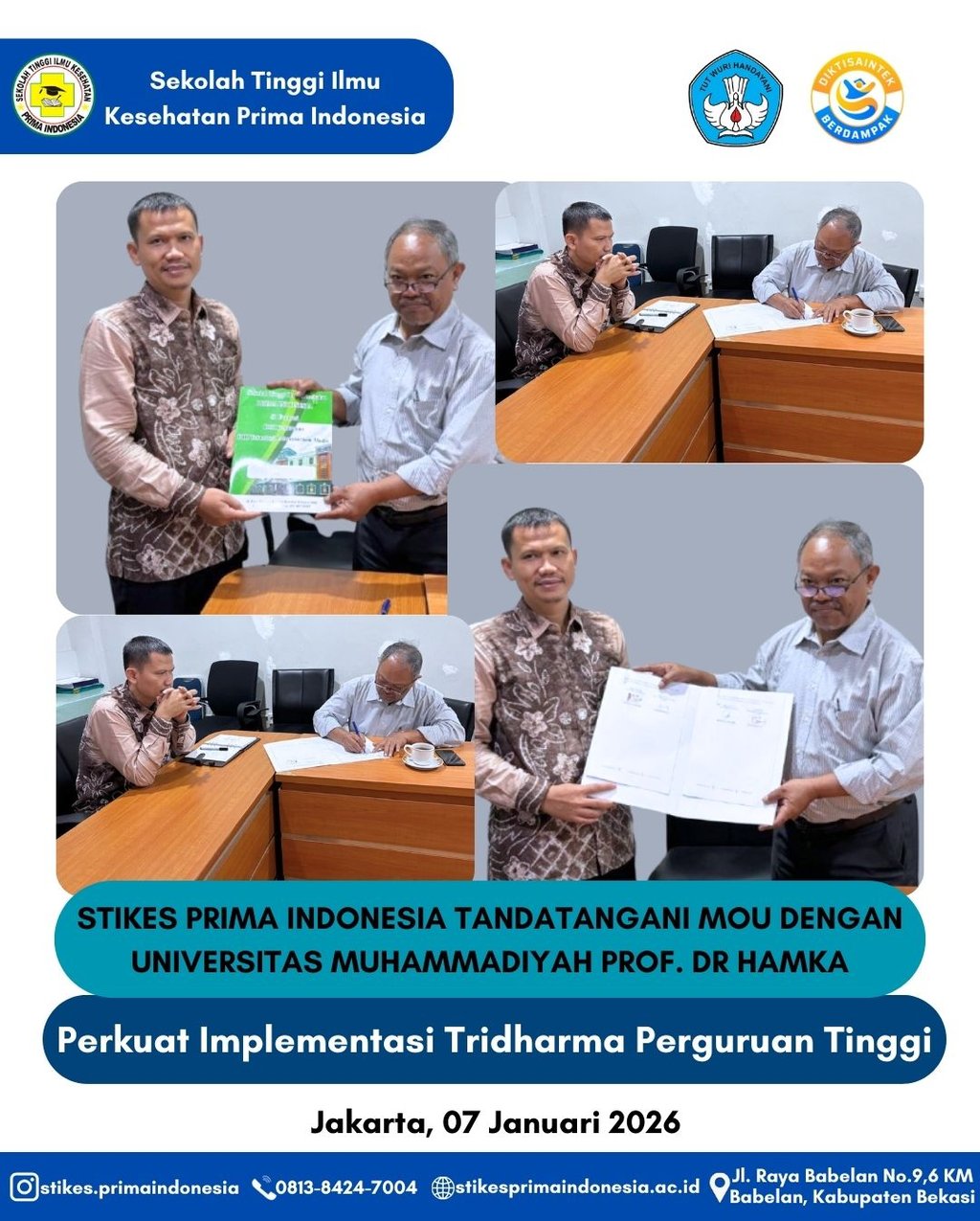 STIKes Prima Indonesia resmi menandatangani Nota Kesepahaman (Memorandum of Understanding/MoU) dengan Universitas Muhammadiyah Prof. Dr. Hamka (UHAMKA) sebagai langkah strategis dalam memperkuat pelaksanaan Tridharma Perguruan Tinggi. Kerja sama ini mencakup pengembangan bidang pendidikan, penelitian, dan pengabdian kepada masyarakat.