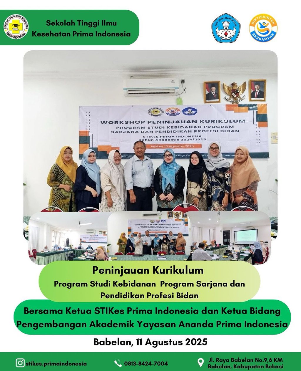 Kegiatan peninjauan kurikulum Program Studi Diploma Tiga Kebidanan pada Senin, 11 Agustus 2025 dilaksanakan sebagai upaya memastikan kesesuaian materi pembelajaran dengan perkembangan ilmu pengetahuan, teknologi, dan kebutuhan dunia kerja. Dalam kegiatan ini, Ketua STIKes Prima Indonesia bersama Ketua Bidang Pengembangan Akademik Yayasan Ananda Prima Indonesia serta Dosen Program Studi berdiskusi dan menyelaraskan strategi kurikulum dan pembelajaran agar lulusan memiliki kompetensi yang unggul dan relevan. Peninjauan ini menjadi langkah penting untuk menjaga mutu pendidikan dan menjawab tantangan zaman.