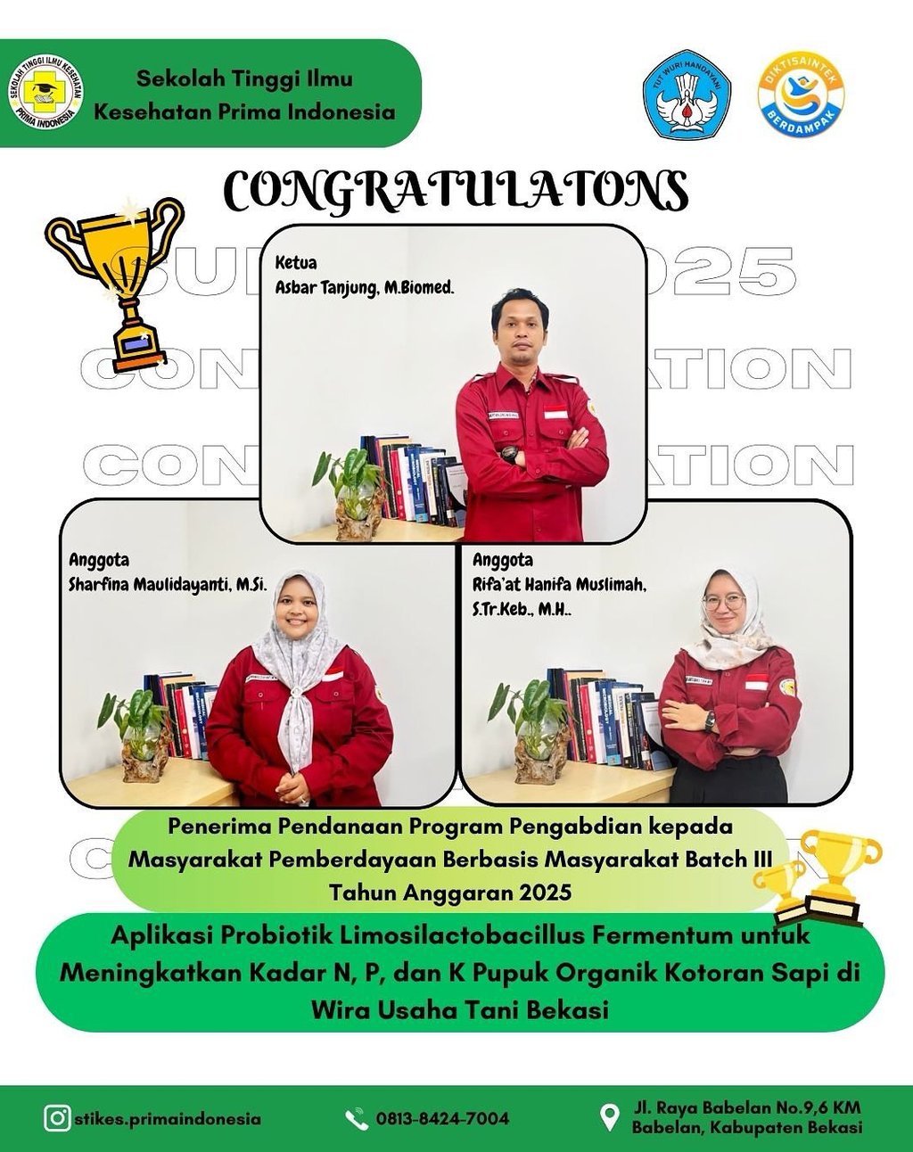 Berdasarkan Pengumuman Penerima Pendanaan Program Pengabdian kepada Masyarakat Pemberdayaan Berbasis Masyarakat Batch III Tahun Anggaran 2025, terdapat 1 (satu) nama penerima dari STIKes Prima Indonesia, yaitu: