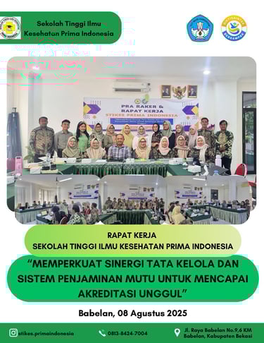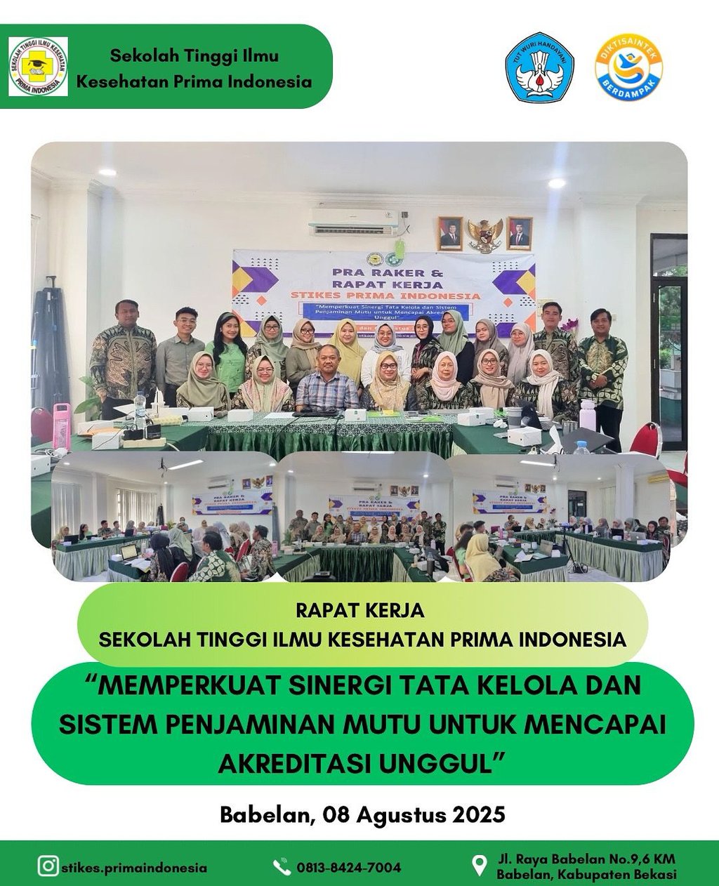 Rapat Kerja Sekolah Tinggi Ilmu Kesehatan Prima Indonesia berlangsung pada Jumat, 08 Agustus 2025 mengusung Tema "Memperkuat Sinergi Tata Kelola dan Sistem Penjaminan Mutu untuk Mencapai Akreditasi Unggul", dihadiri oleh perwakilan Yayasan Ananda Prima Indonesia Dr. apt. Indah Zahara, M.Farm. (Ketua Bidang Pengembangan Akademik) dan dibuka langsung oleh Ketua STIKes Prima Indonesia Heny Kristanto, S.Kp., M.Kes.